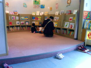 こういうスペースも必要だと思うけれど、絵本は誰でも手軽に手に取れる位置に置いてほしい。