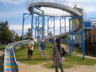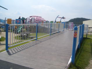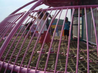 スロープがあるので車いすのまま、部分的ですが遊具の2階にあたるところまで行けました。