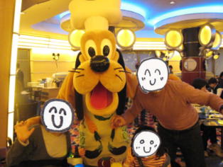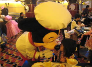 ビッフェスタイルで、ディズニーキャラクターたちが各テーブルを順番にまわって、